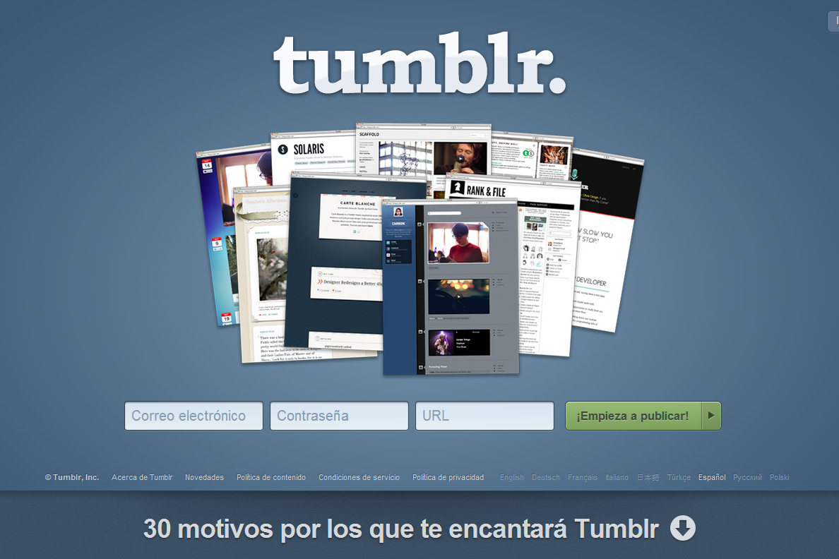 Tumblr es una plataforma de microblogging creada por David Karp en el año 2007 que permite a los usuarios publicar textos, imágenes, vídeos, enlaces, citas y audio a manera de tumblelog o red social multimedia,
